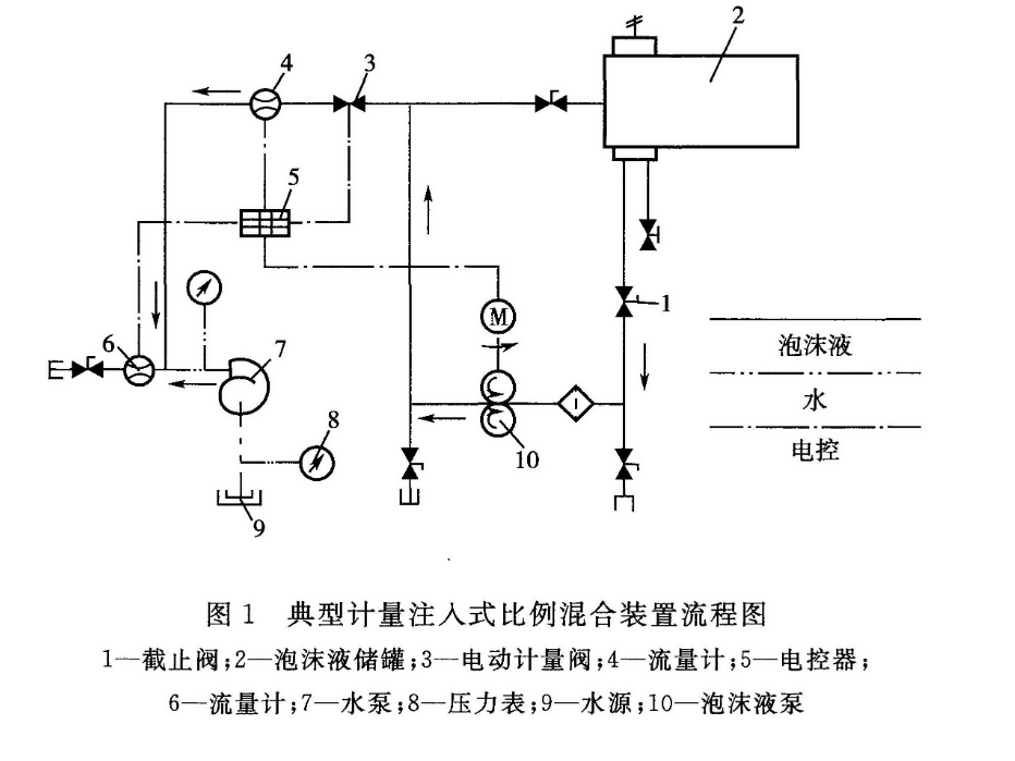 无囊式压力比例混合装置工作时,要求水必须从泡沫液面充入。因此,只适用于密度较高的蛋白类泡沫液。因泡沫液与水直接接触,一次未用完不能再用,不便于系统调试及日常试验等,也已退市。 计量注入式比例混合装置是用泡沫液泵将泡沫液直接注到水流中,利用在线流量计自动调节混合比的装置。系统运行数据传输到一台电控器上,其控制泡沫液泵输出量来保持既定的混合比。计量注入式比例混合装置有若干种型式,图1是其中一种典型的计量注入式比例混合装置流程图。该比例混合装置由美国开发,主要用于消防车,在固定系统上应用极少。计量注入式比例混合装置结构复杂,对设计、安装、调试、维护管理人员的技术能力要求较高,在我国固定式系统中很难推广使用。