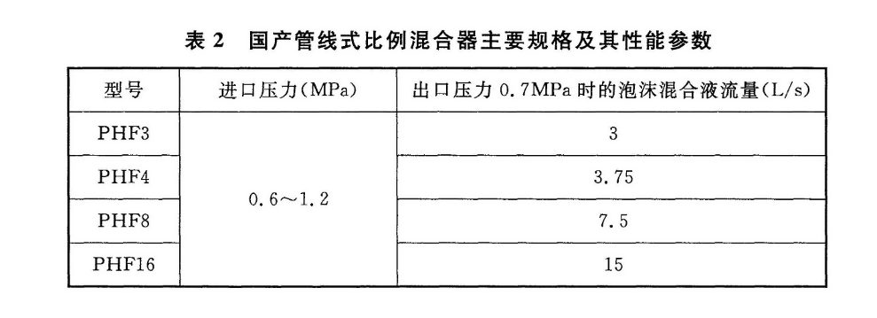 3.4.6 管线式比例混合器工作流量范围小(表2),压力损失大(约为进口压力的1/3),用于移动式或半固定式泡沫灭火系统。本条是依据有关试验制定的。