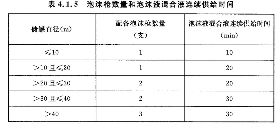4.1.5 设置固定式系统的储罐区,应配置用于扑救液体流散火灾的辅助泡沫枪,泡沫枪的数量及其泡沫混合液连续供给时间不应小于表4.1.5的规定。每支辅助泡沫枪的泡沫混合液流量不应小于240L/min。