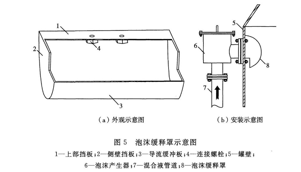 3 水溶性液体固定顶储罐不设缓释装置较难灭火,本标准规定的设计参数是建立在设有缓冲装置基础上的,2010年版的美国消防协会标准《低倍数、中倍数、高倍数泡沫灭火系统标准》NFPA11的相关说法并不准确。天津消防研究所会同有关单位开展的公安部科技强警基础工作专项“水溶性可燃液体储罐泡沫灭火机理与技术研究”及中石化科研项目“水溶性可燃液体储罐泡沫灭火关键技术研究”表明,对乙醇等水溶性液体,强释放无法控火,即便是溶解度较低的水溶性液体,使用强释放也难以完全灭火。目前,除水溶性液体外,其他对普通泡沫有破坏作用的甲、乙、丙类液体主要为添加醇、醚等物质的汽油,国内该类汽油的醇、醚含量比较低,此类储罐不设缓冲装置亦能灭火。目前我国开发的泡沫缓释罩见图5。