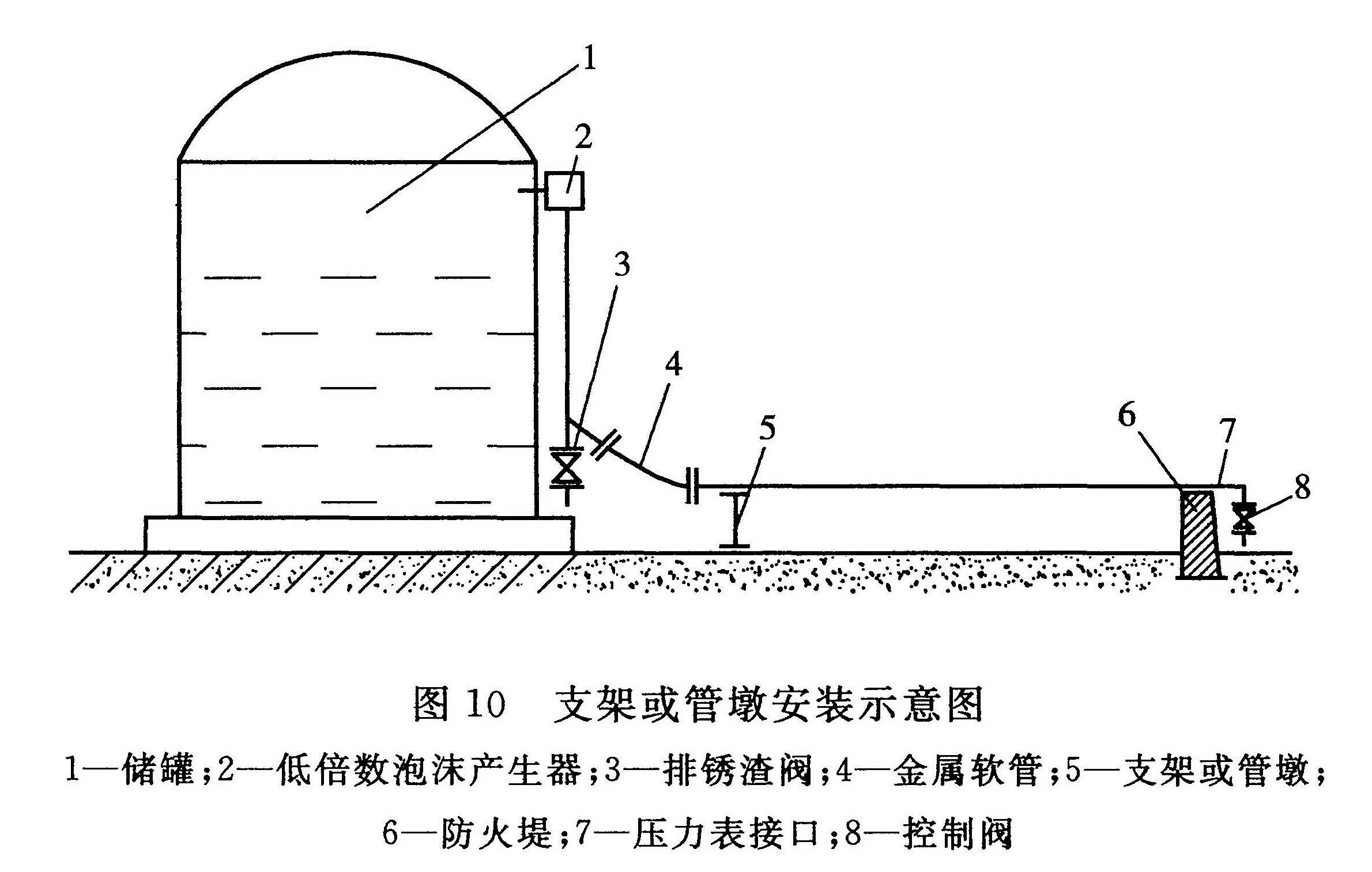 5 泡沫产生装置入口处的管道应用管卡固定在支架上,其出口管道在储罐上的开口位置和尺寸应满足设计及产品要求。