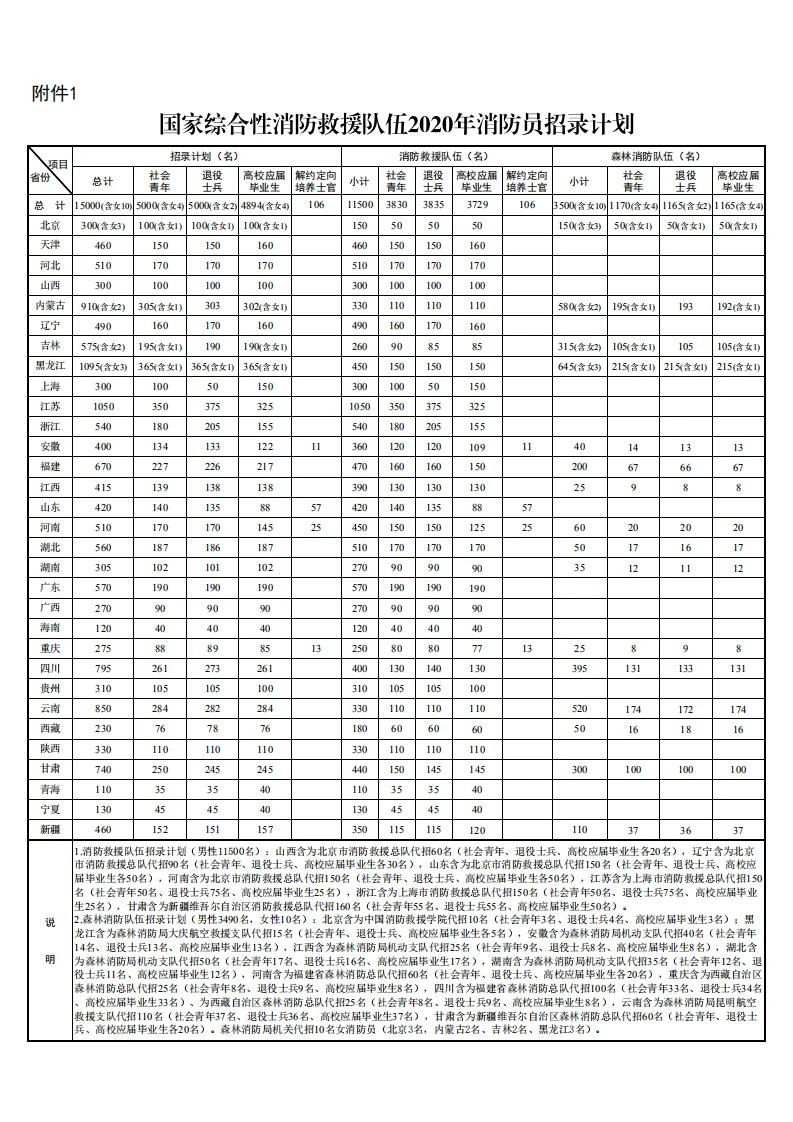 附件:1.国家综合性消防救援队伍2020年消防员招录计划
