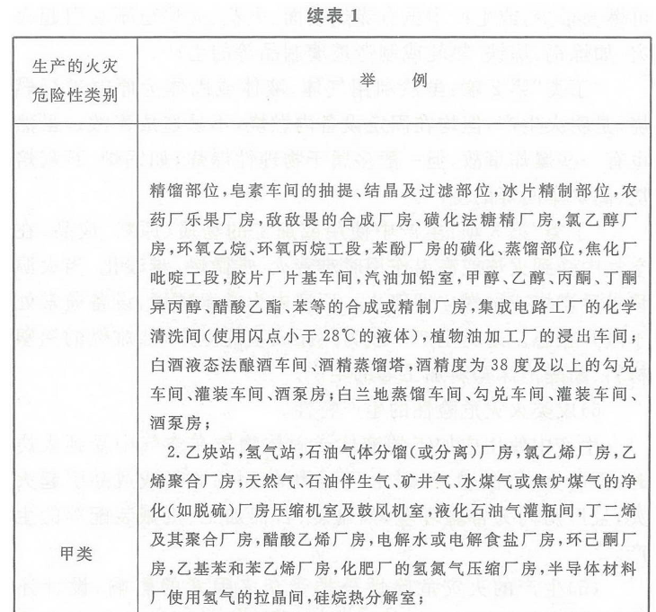 生产的火灾危险性分类受众多因素的影响,设计还需要根据生产工艺、生产过程中使用的原材料以及产品及其副产品的火灾危险性以及生产时的实际环境条件等情况确定。为便于使用,表1列举了部分常见生产的火灾危险性分类。