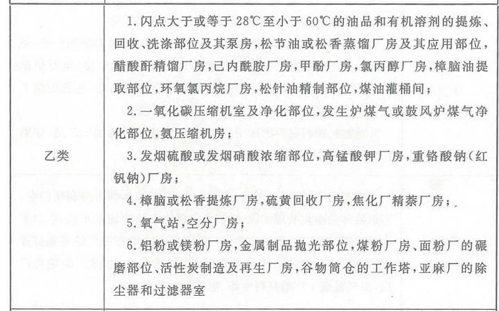 “乙类”第4项:生产中的物质燃点较低、较易燃烧或爆炸,燃烧性能比甲类易燃固体差,燃烧速度较慢,但可能放出有毒气体,如硫磺、樟脑或松香等的生产。