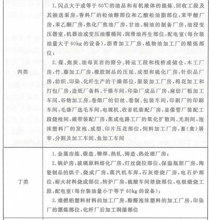 “丁类”第2项:虽然利用气体、液体或固体为原料进行燃烧,是明火生产,但均在固定设备内燃烧,不易造成事故。虽然也有一些爆炸事故,但一般多属于物理性爆炸,如锅炉、石灰焙烧、高炉车间等的生产。