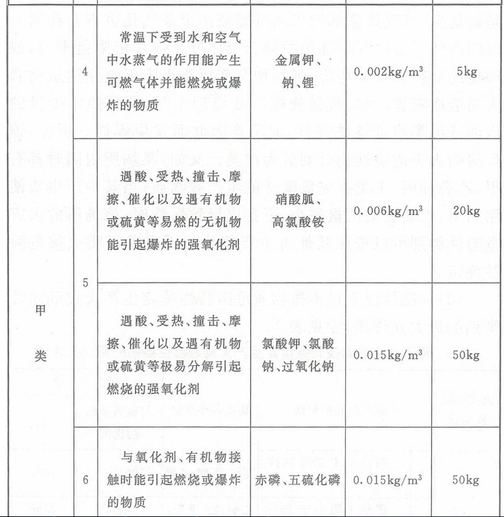 “甲类”第4项:生产中的物质遇水或空气中的水蒸气会发生剧烈的反应,产生氢气或其它可燃气体,同时产生热量引起燃烧或爆炸。该类物质遇酸或氧化剂也能发生剧烈反应,发生燃烧爆炸的火灾危险性比遇水或水蒸气时更大,如金属钾、钠、氧化钠、氢化钙、碳化钙、磷化钙等的生产。
