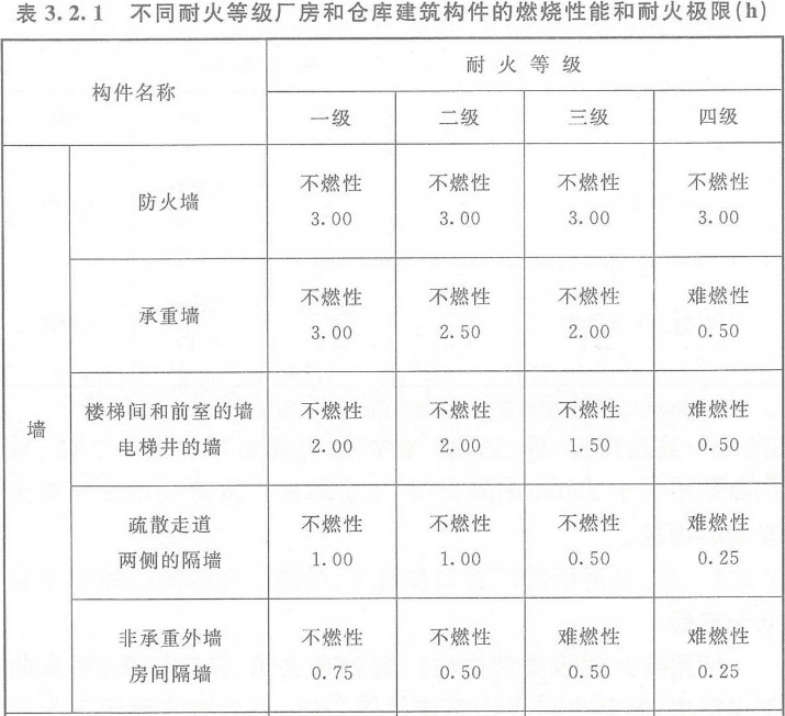 3.2.1 厂房和仓库的耐火等级可分为一、二、三、四级,相应建筑构件的燃烧性能和耐火极限,除本规范另有规定外,不应低于表3.2.1的规定。