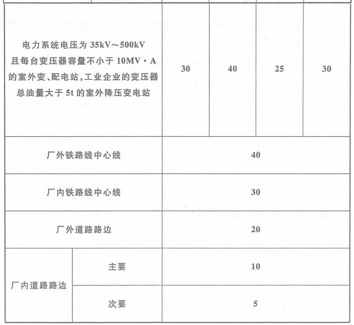 (3) 甲类仓库与铁路线的防火间距,主要考虑蒸汽机车飞火对仓库的影响。甲类仓库与道路的防火间距,主要考虑道路的通行情况、汽车和拖拉机排气管飞火的影响等因素。一般汽车和拖拉机的排气管飞火距离远者为8m~10m,近者为3m~4m。考虑到车辆流量大且不便管理等因素,与厂外道路的间距要求较厂内道路要大些。根据表3.5.1,储存甲类物品第1、2、5、6项的甲类仓库与一、二级耐火等级乙、丙、丁、戊类仓库的防火间距最小为12m。但考虑到高层仓库的火灾危险性较大,表3.5.1的注将该甲类仓库与乙、丙、丁、戊类高层仓库的防火间距从12m增加到13m。