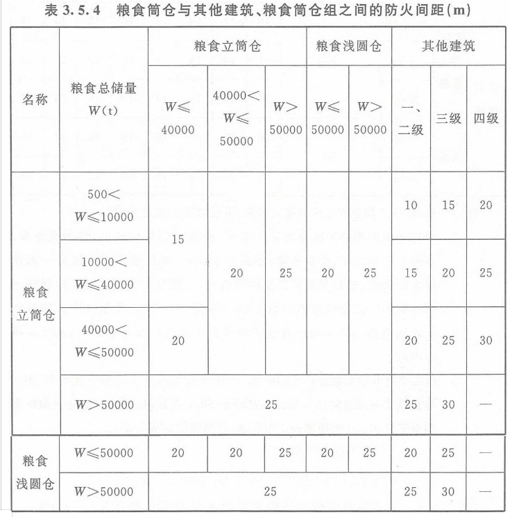 3.5.4 粮食筒仓与其他建筑、粮食筒仓组之间的防火间距,不应小于表3.5.4的规定。
