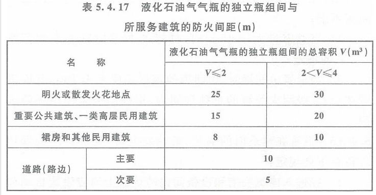 3 液化石油气气瓶的总容积大于1m³、不大于4m³的独立瓶组间,与所服务建筑的防火间距应符合本规范表5.4.17的规定;