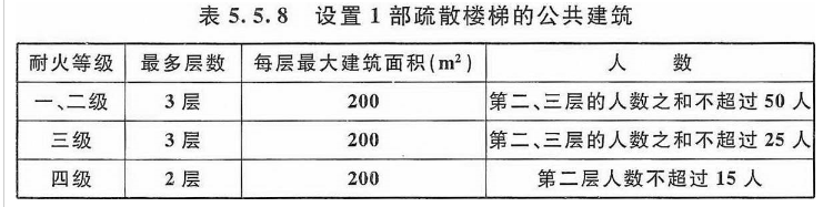 5.5.8 公共建筑内每个防火分区或一个防火分区的每个楼层,其安全出口的数量应经计算确定,且不应少于 2 个。设置 1 个安全出口或 1 部疏散楼梯的公共建筑应符合下列条件之一: