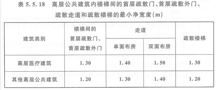 高层公共建筑内楼梯间的首层疏散门、首层疏散外门、疏散走道和疏散楼梯的最小净宽度应符合表5.5.18的规定。