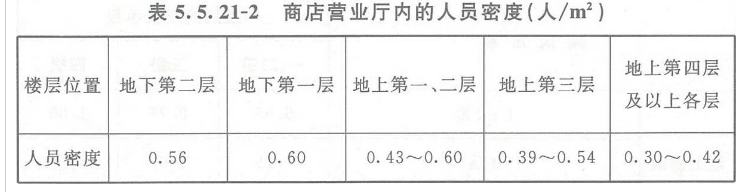 据表5.5.21-2确定人员密度值时,应考虑商店的建筑规模,当建筑规模较小(比如营业厅的建筑面积小于3000m²)时宜取上限值,当建筑规模较大时,可取下限值。当一座商店建筑内设置有多种商业用途时,考虑到不同用途区域可能会随经营状况或经营者的变化而变化,尽管部分区域可能用于家具、建材经销等类似用途,但人员密度仍需要按照该建筑的主要商业用途来确定,不能再按照上述方法折减。
