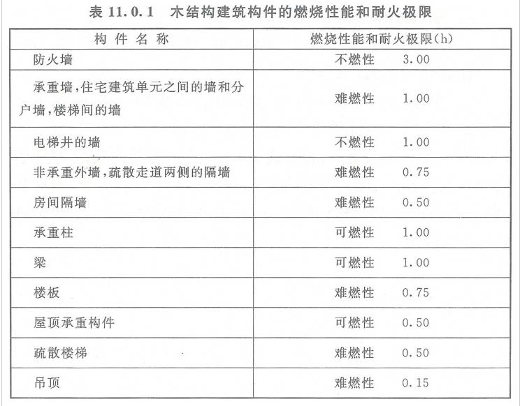 11.0.1 木结构建筑的防火设计可按本章的规定执行。建筑构件的燃烧性能和耐火极限应符合表11.0.1的规定。