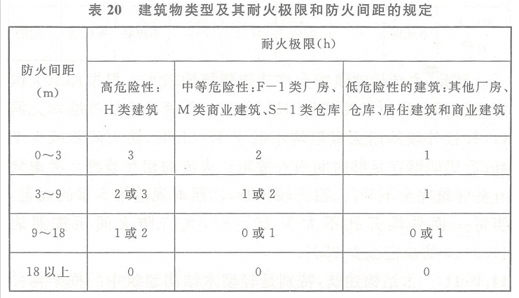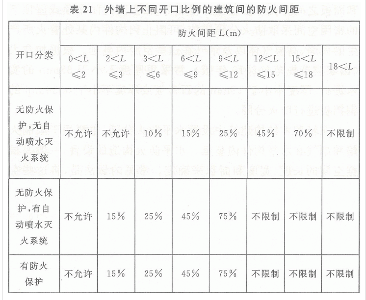 试验证明,发生火灾的建筑对相邻建筑的影响与该建筑物外墙的耐火极限和外墙上的门、窗或洞口的开口比例有直接关系。美国《国际建筑规范》(2012年版)对建筑物类型及其耐火性能和防火间距的规定见表20,对外墙上不同开口比例的建筑间的防火间距的规定见表21。