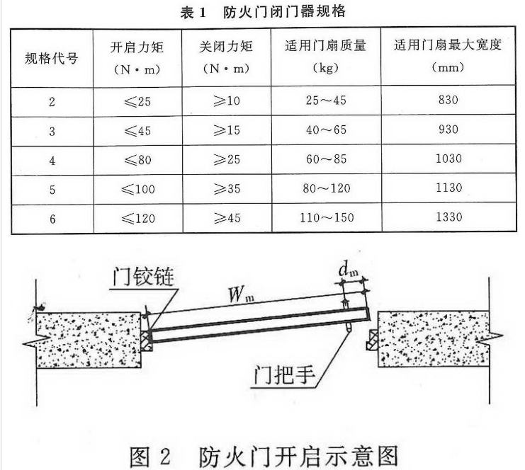 楼梯间的机械加压送风量: Lj=L1+L2=6.72+1.21=7.93m³/s=28548(m³/h) 设计风量不应小于计算风量的1.2倍,因此设计风量不小于28548×1.2=34257.6(m³/h)。 2) 合用前室机械加压送风量计算: 对于合用前室,开启着火层楼梯间疏散门时,为保持走廊开向前室门洞处风速所需的送风量L1确定: 每层开启门的总断面积Ak=1.6×2.0=3.2(m²); 门洞断面风速v取0.7m/s; 常闭风口,开启门的数量N1=3; L1=AkvN1=3.2×0.7×3=6.72(m³/s) 送风阀门的总漏风量L3确定: 常闭风口,漏风阀门的数量N3=13; 每层送风阀门的面积为AF=0.9m²;L3=0.083AFN3=0.083×13×0.9=0.97(m³/s) 当楼梯间至合用前室的门和合用前室至走道的门同时开启时,机械加压送风量为:Ls=L1+L3=6.72+0.97=7.69m³/s= 27684(m³/h) 设计风量不应小于计算风量的1.2倍,因此设计风量是27684×1.2=33220.8(m³/h)。 (3) 如果考虑楼梯间窗缝漏风的情况。 现行国家标准《民用建筑供暖通风与空气调节设计规范》GB 50736对外窗气密性有要求,根据建筑类型(居住建筑和公共建筑)、地区类型(夏热冬冷地区、严寒地区、寒冷地区、夏热冬暖地区)以及建筑高度等,气密性的要求不同。以单位缝长的漏风量(以下为q1)或单位面积的漏风量(以下为q2)为指标,为方便计算,可以取值为: 居住建筑:q1≤2.5m³/(m·h);q2≤7.5m³/(m²·h); 公共建筑:q1≤1.5m³/(m·h);q2≤4.5m³/(m²·h); 如果以15层居住建筑,每层外窗面积1.5m×1m计算,以面积计算则每层漏风7.5×1.5=11.25(m³/h),共计11.25×15=168.75(m³/h); 以缝长计算则每层漏风2.5×5=12.5(m³/h),共计12.5×15=187.5(m³/h)。 如果以15层公共建筑,每层外窗面积2m×1m计算,以面积计算则每层漏风4.5×2=9(m³/h),共计4.5×2×15=135(m³/h); 以缝长计算则每层漏风1.5×6=9(m³/h),共计9×15=135(m³/h)。 另外,需要说明的是,上述漏风量指标是在10Pa的压差的条件下。本标准中计算漏风量的平均压力差(Pa),当开启门洞处风速为0.7m/s时取6.0Pa;当开启门洞处风速为1.0m/s时取12.0Pa;当开启门洞处风速为1.2m/s时取17.0Pa。压差在这个范围内差异对漏风量的影响不大。 所以,在门开启时,窗缝的漏风量很小,可以忽略不计。如果一定要计算在内,则可以按照上述单位缝长的漏风量或单位面积的漏风量指标计算。这些指标均来自现有的国家标准,具有依据性。3.4.9 对于楼梯间及前室等空间,由于加压送风作用力的方向与疏散门开启方向相反,如果压力过高,造成疏散门开启困难,影响人员安全疏散;另一方面,疏散门开启所克服的最大压力差应大于前室或楼梯间的设计压力值,否则不能满足防烟的需要。因此本条规定了最大允许压力差,为设计和实际送风时的压力检测提供依据。公式参考美国国际规范委员会规范《International Building Code》(国际建筑规范)的有关公式。根据现行行业标准《防火门闭门器》GA 93,防火门闭门器规格见表1。防火门开启示意见图2。