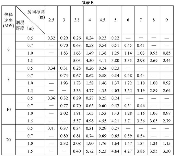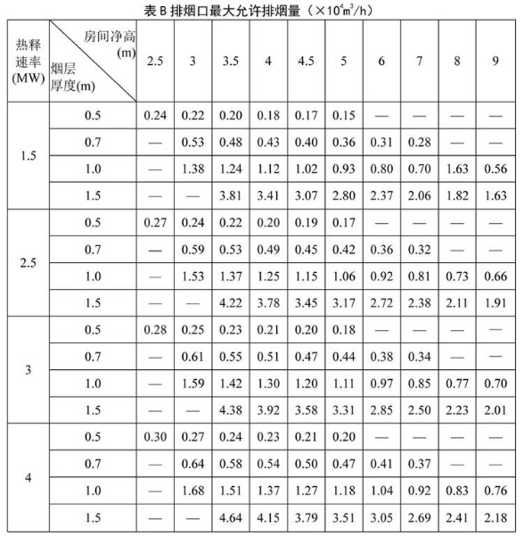 2 本表仅列出了部分火灾热释放速率、部分空间净高、部分设计烟层厚度条件下,排烟口的最大允许排烟量。