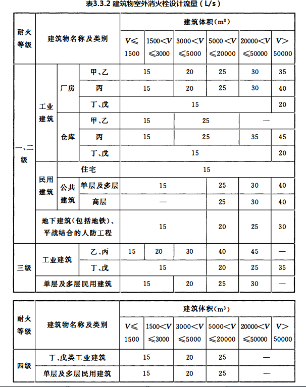 本条规定了工厂、仓库和民用建筑的室外消火栓设计流量。