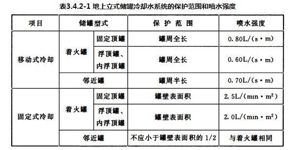 甲、乙、丙类可燃液体地上立式储罐冷却水系统保护范围和喷水强度不应小于本规范表3.4.2-1的规定;卧式储罐、无覆土地下及半地下立式储罐冷却水系统保护范围和喷水强度不应小于本规范表3.4.2-2的规定;室外消火栓设计流量应按本规范第3.4.2条第3款的规定确定。