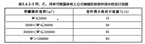 3 当储罐采用固定式冷却水系统时室外消火栓设计流量不应小于表3.4.2-3的规定,当采用移动式冷却水系统时室外消火栓设计流量应按表3.4.2-1或表3.4.2-2规定的设计参数经计算确定,且不应小于15L/s。