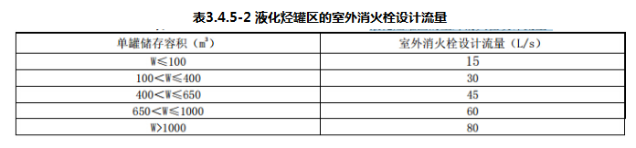 3.4.5 液化烃罐区的消防给水设计流量应按最大罐组确定,并应按固定冷却水系统设计流量与室外消火栓设计流量之和确定,同时应符合下列规定: