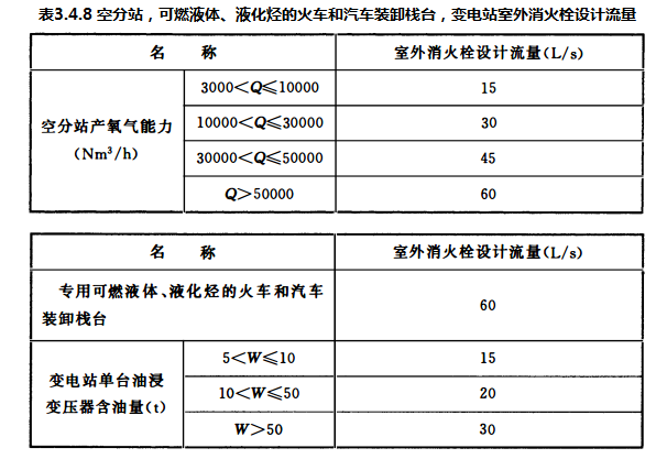3.4.8 本条规定了空分站,可燃液体、液化烃的火车和汽车装卸栈台,变电站的室外消火栓设计流量。