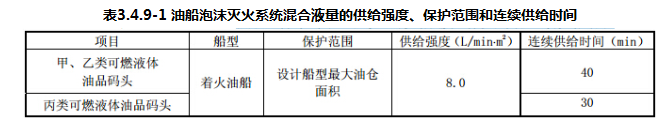泡沫灭火系统设计流量应按系统扑救着火油船一起火灾的泡沫混合液量及泡沫液混合比经计算确定,泡沫混合液供给强度、保护范围和连续供给时间不应小于表3.4.9-1的规定,并应符合现行国家标准《泡沫灭火系统设计规范》GB