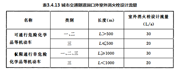 3.4.13 城市交通隧道洞口外室外消火栓设计流量不应小于表3.4.13的规定。