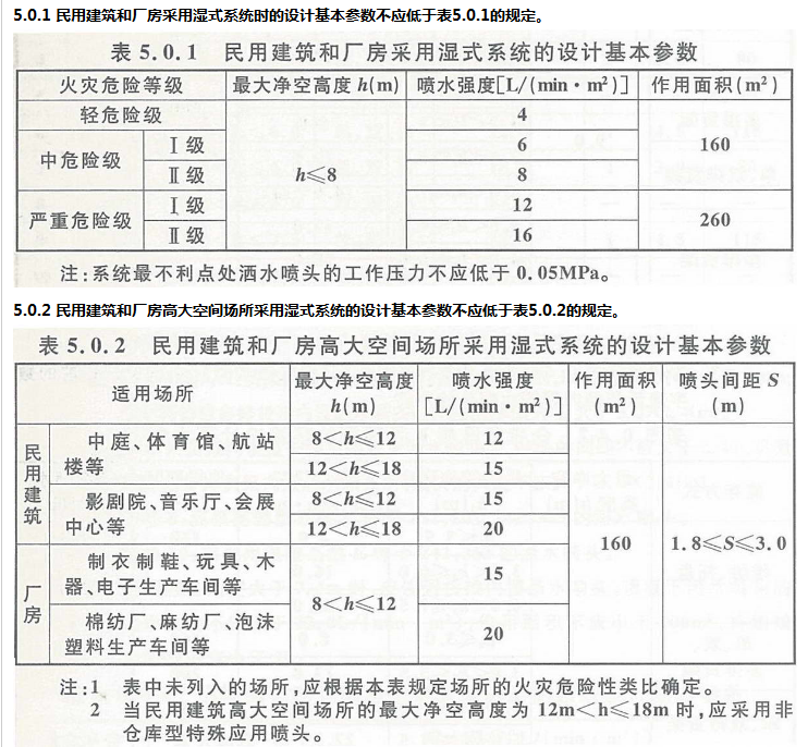 本条规定了不同危险等级场所设置自动喷水灭火系统时的设计基本参数。表5.0.1为湿式系统设计的基本参数,其他类型系统的设计参数均是以此表为基础进行确定。