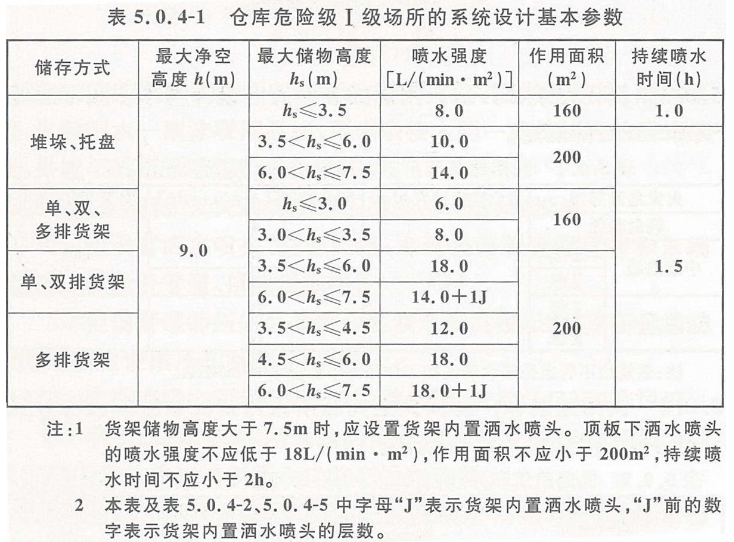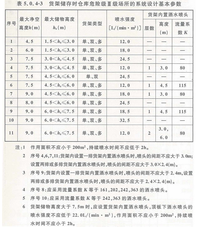 、仓库危险级Ⅱ级场所中混杂储存仓库危险级Ⅲ级物品时,系统设计基本参数不应低于表5.0.4-5的规定。