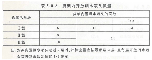 洒水喷头间距不应大于3m,且不应小于2m。计算货架内开放洒水喷头数量不应小于表5.0.8 的规定;