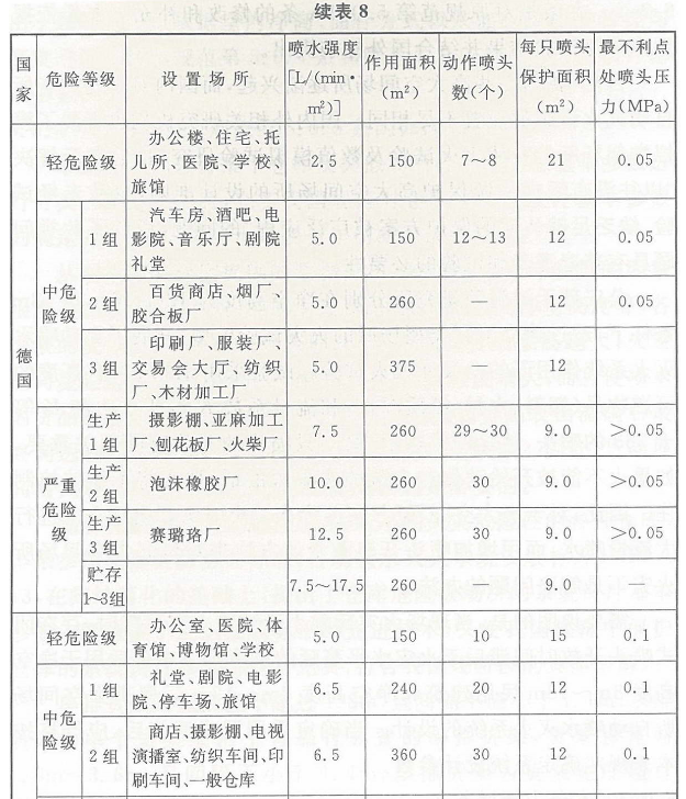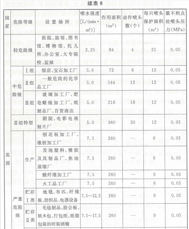 13的规定,每个火灾危险等级对应的曲线上的任一点均是可取的,通常情况下,为求得经济效果,多选择喷水强度大而作用面积小的一点,这也符合“大强度喷水有利于迅速控灭火和有利于缩小喷水作用面积”的试验与经验的总结,本条在制定时选取该曲线中喷水强度的上限数据,并适当加大作用面积后确定为本规范的设计基本参数。这样的技术处理,既便于设计人员操作,又提高了规范的应变能力和系统的经济性能,同时又能保证系统可靠地发挥作用。表8为英国、美国、德国和日本等国的设计基本数据。