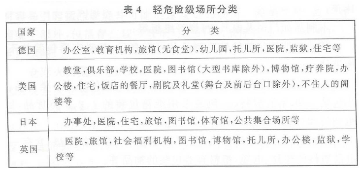 国外标准规范大多将自动喷水灭火系统的设置场所划分为三个或四个火灾危险等级。如英国将设置场所划分为三个危险等级,即轻危险级、中轻危险级(其中又分为4组,OH1~OH4)和高危险级(其中又分为生产加工级和贮存级,每个级别又划分为4类,分别是HHP1~HHP4和HHS1~HHS4)。德国划分为四个危险等级,即Ⅰ、Ⅱ、Ⅲ、Ⅳ级,分别为轻、中、严重(其中又分为生产级和储存级)危险级。美国和日本则划分为轻、中和严重危险级。