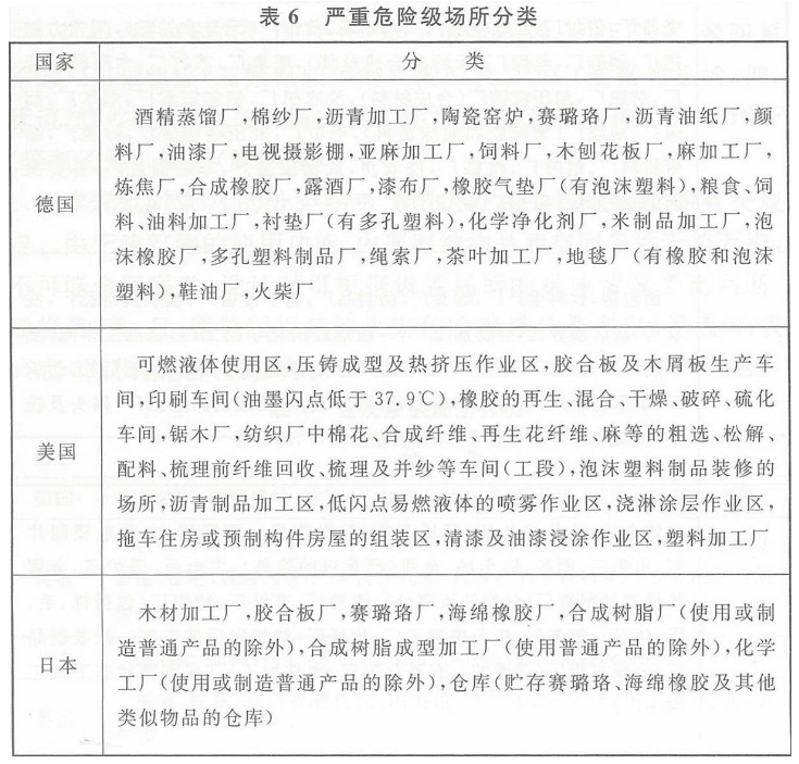 本规范附录A的举例参考了国内外相关规范标准的有关规定。由于建筑物的使用功能、内部容纳物品和空间条件千差万别,不可能全部列举,设计时可根据设置场所的具体情况类比判断。现将美、英、日、德等国规范的火灾危险等级分类列出(见表4、表5、表6),供相关人员参考。