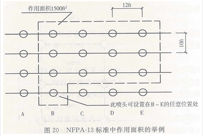 德国标准《喷水装置规范》(1980年版)规定:首先确定作用面积的位置,再求出作用面积内的喷头数。要求各单独喷头的保护面积与作用面积内所有喷头的平均保护面积的误差不超过20%。这里相邻四个喷头之间的围合范围为一个喷头的保护面积。