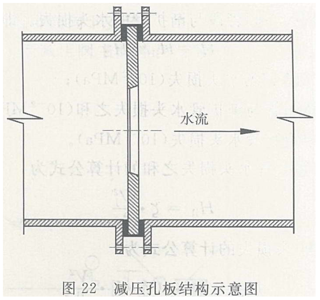 本条规定了对设置减压孔板管段的要求。要求减压孔板采用不锈钢板制作,按常规确定的孔板厚度:Φ50~80mm时,δ=3mm;Φ100~150mm时,δ=6mm;Φ200mm时,δ=9mm。减压孔板的结构示意图见图22。