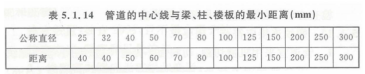 检查方法:观察检查。Ⅱ 一般项目5.1.14 管道的安装位置应符合设计要求。当设计无要求时,管道的中心线与梁、柱、楼板等的最小距离应符合表5.1.14的规定。公称直径大于或等于100mm的管道其距离顶板、墙面的安装距离不宜小于200mm。