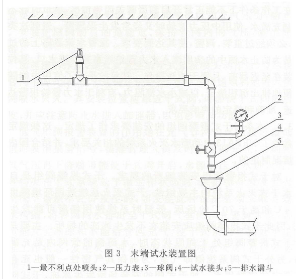 本规范实施几年来,各地反映较多的问题是,不少工程由于没有设计和安装调试、检测用的阀门和管路,系统调试和检测无法进行。遇到此类工程,一般都是利用末端试水装置进行试验,利用试验结果进行推理式判断,无法测得科学实际的技术数据。这里应指出的是,消防界人士十余年来对末端试水装置存在着夸大其功能的认识误区,普遍认为通过末端试水装置可以检测系统动作功能、系统供水能力、最不利点喷头的压力等,这是造成一般不设计调试、检测试验管道及阀门的一个主要原因。末端试水装置,至今没有统一的标准结构和设计技术要求,设计、安装单位的习惯经验做法是其结构由阀门,压力表,流量测试仪表(标准放水口或流量计)和管道组成见图(见图3),管道一般是用管径为25mm、32mm、40mm的镀锌钢管。开启末端试水装置进行试验时,测试得到的压力和流量数据,只是在测试位置处的流量和压力数据,并没有经验公式能利用此数据科学推算出系统供水能力(压力,流量),更不能判断系统的最不利点压力是否符合设计要求。末端试水装置的真正功能是检索系统启动、报警和利用系统启动后的特性参数组成联动控制装置等的功能是否正常。