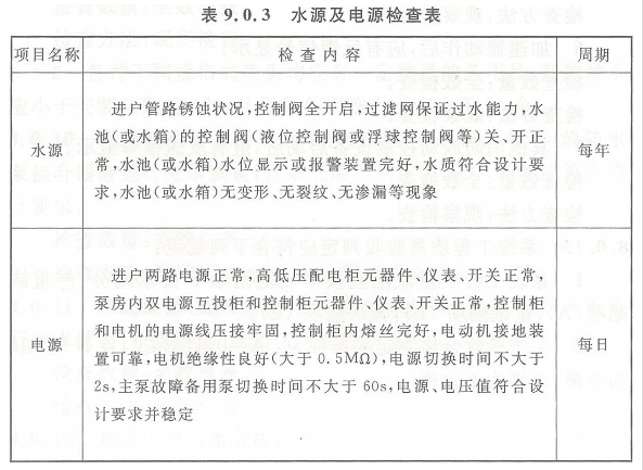 每年应对水源的供水能力进行一次测定,每日应对电源进行检查。检查内容见表9.0.3。