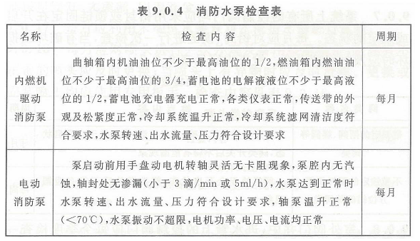 消防水泵或内燃机驱动的消防水泵应每月启动运转一次。当消防水泵为自动控制启动时,应每月模拟自动控制的条件启动运转一次。检查内容见表9.0.4。