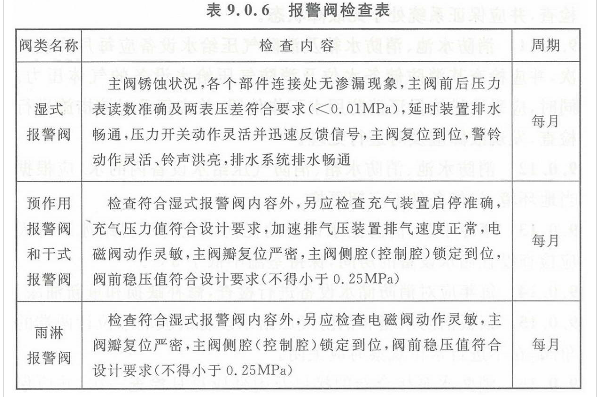 每个季度应对系统所有的末端试水阀和报警阀旁的放水试验阀进行一次放水试验,检查系统启动、报警功能以及出水情况是否正常。检查内容见表9.0.6。