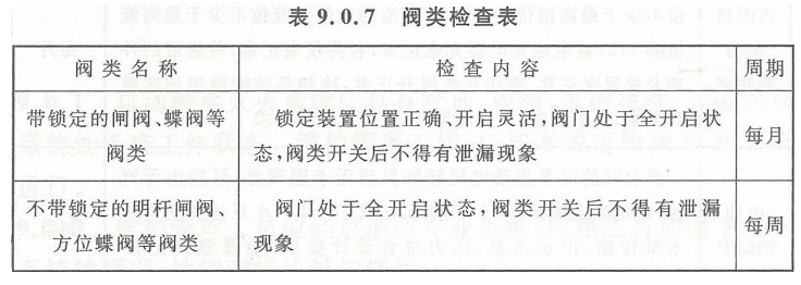 系统上所有的控制阀门均应采用铅封或锁链固定在开启或规定的状态。每月应对铅封、锁链进行一次检查,当有破坏或损坏时应及时修理更换。检查内容见表9.0.7。
