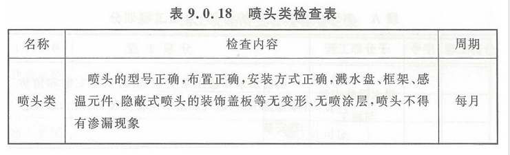 每月应对喷头进行一次外观及备用数量检查,发现有不正常的喷头应及时更换;当喷头上有异物时应及时清除。更换或安装喷头均应使用专用扳手。检查内容见表9.0.18。