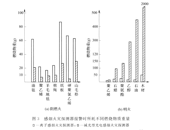 给出了点型离子感烟火灾探测器和点型散射型光电火灾感烟探测器在标准燃烧实验中,燃烧不同的物质使探测器报警所需的物料消耗。
