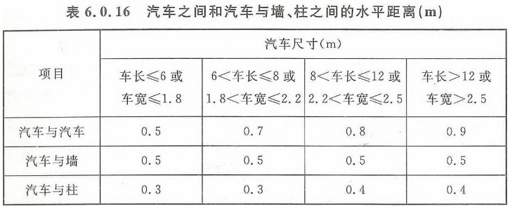 除室内无车道且无人员停留的机械式汽车库外,汽车库内汽车之间和汽车与墙、柱之间的水平距离,不应小于表6.0.16的规定。