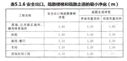 安全出口、疏散楼梯和疏散走道的最小净宽应符合表5.1.6的规定。