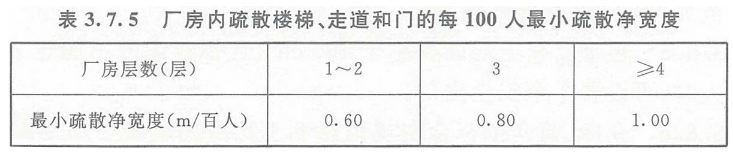 3.7.5 本条规定了厂房的百人疏散宽度计算指标、疏散总净宽度和最小净宽度要求。
