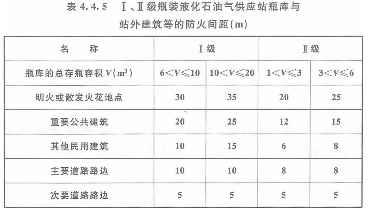 Ⅰ、Ⅱ级瓶装液化石油气供应站瓶库与站外建筑等的防火间距不应小于表4.4.5的规定。瓶装液化石油气供应站的分级及总存瓶容积不大于1m³的瓶装供应站瓶库的设置,应符合现行国家标准《城镇燃气设计规范》GB