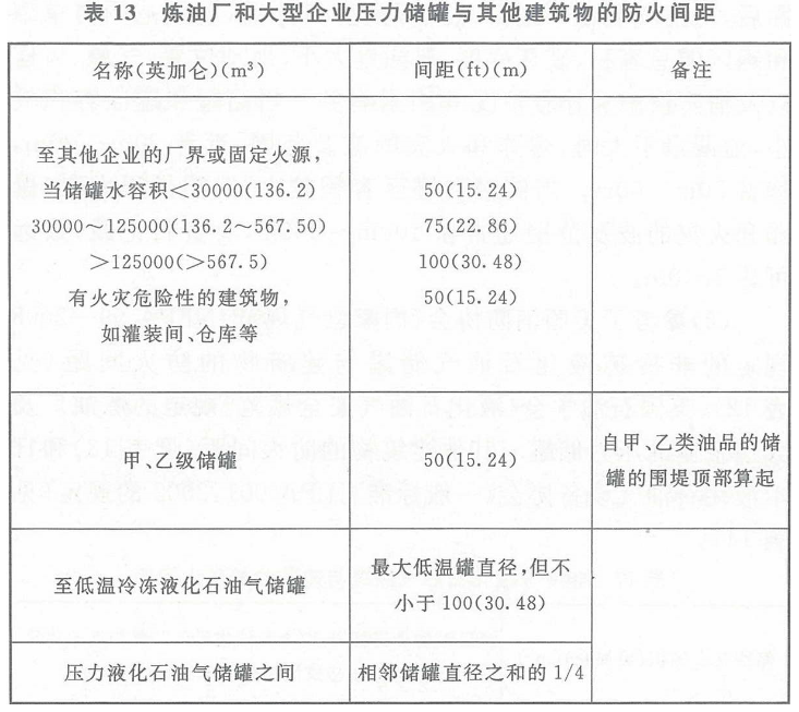 注:储罐与用气厂房的间距可按上表减少50%,但不得低于50ft(15m)表中数字后括号内的数值为按公制单位换算值。1