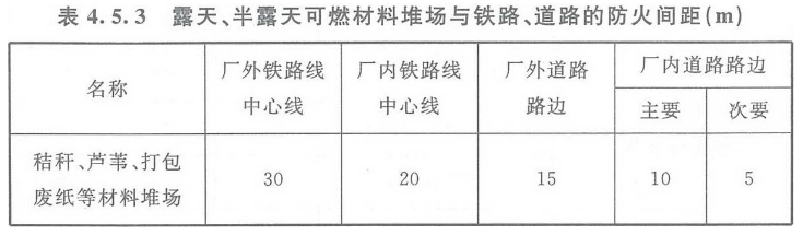 露天、半露天秸杆、芦苇、打包废纸等材料堆场与铁路、道路的防火间距不应小于表4.5.3的规定,其他可燃材料堆场与铁路、道路的防火间距可根据材料的火灾危险性按类比原则确定。